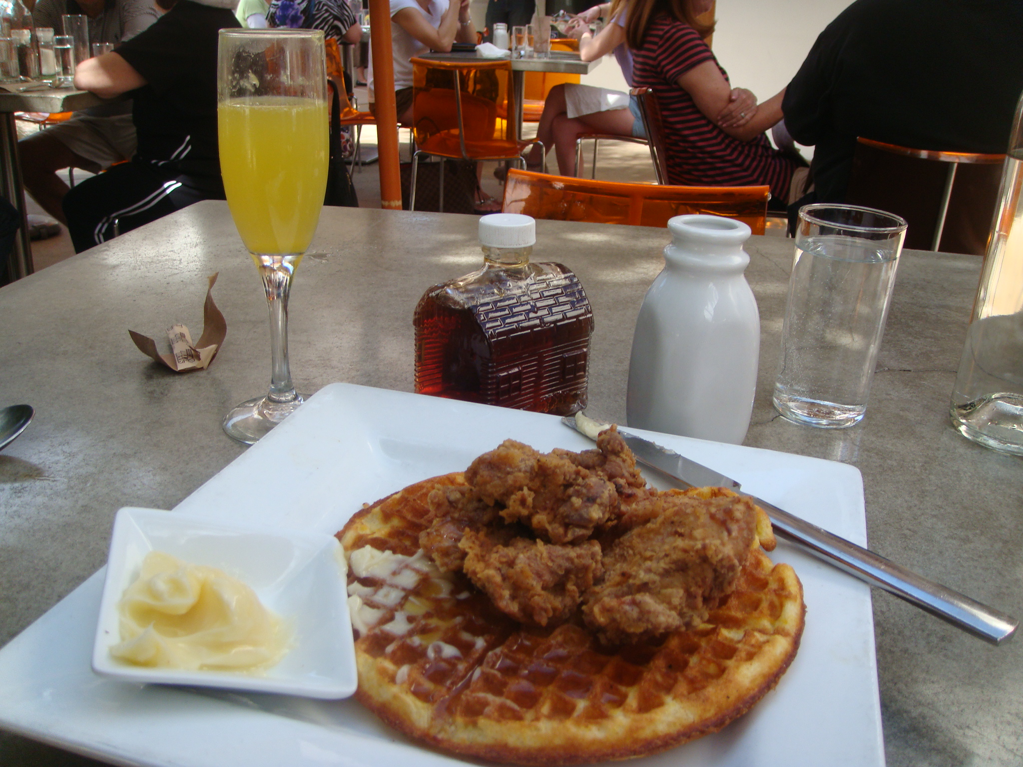 The next morning, I decided to check out CHEEKY’s for breakfast. After waiting 20 minutes, I hear the owner call out “Ursula” which is probably me, since I don’t see the wicked sea witch from the Little Mermaid anywhere. I totally love the tchotchke’s at this place, a small milk bottle for my cream, my miniature French press pot, and mini glass log cabin full of syrup! All I need are some Barbie’s and everything would be complete! I ordered the cornmeal waffles and fried chicken. Very yummy except that I’m a white meat kind of gal, and their seemed to be mostly dark! Nonetheless, paired with a mimosa, it was delicious!