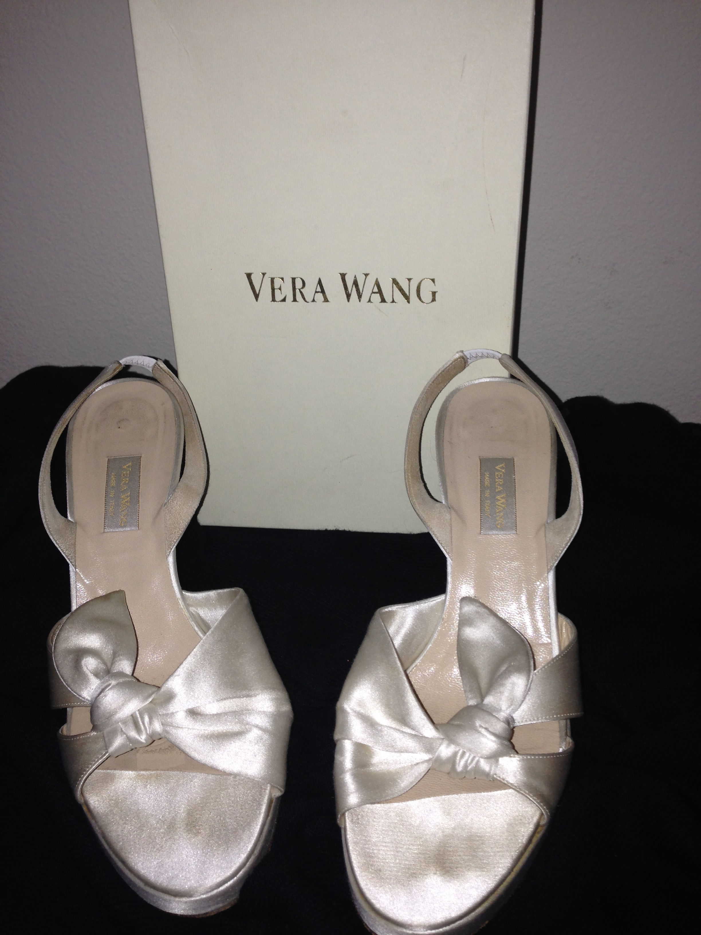 The shoes have been living in my closet for the past 13 years or so, only worn once on my wedding day. Satin white open toe sling back Vera Wangs. I haven’t been able to part with them. They just linger up their on the shelf in my closet crowded by Charles and David’s, Banana Republic, and PRADA.
