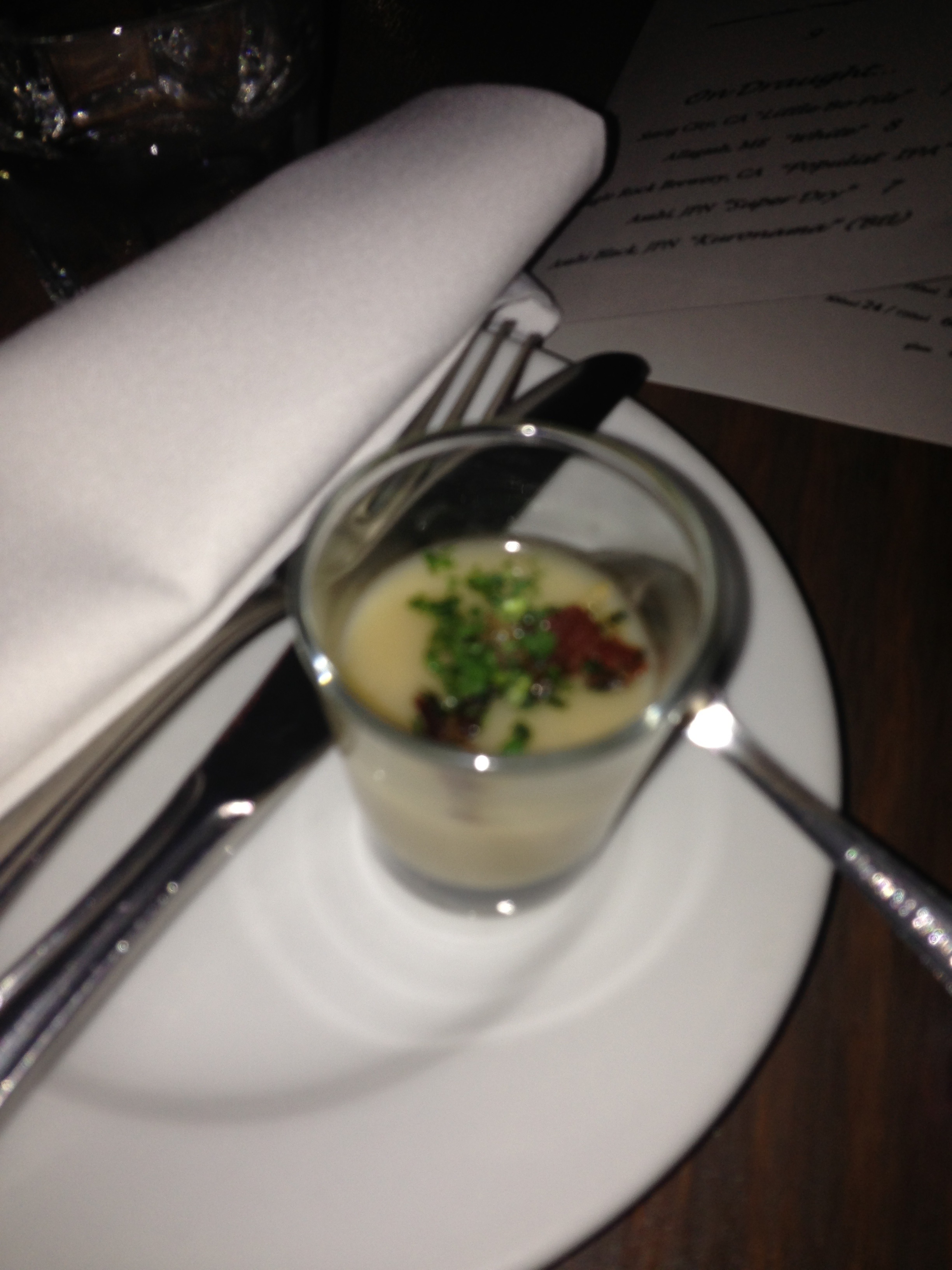 I was greeted by the owner, who pleasantly gave me a shot glass of squash soup top with caramelized prosciutto! The soup definitely got my taste buds ready for what was to come!