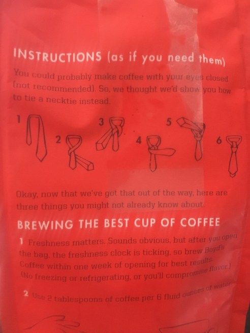 But for some reason this morning the back of the package caught my eye. Along with brewing instructions I read the instructions on “How To Tie A Tie.”