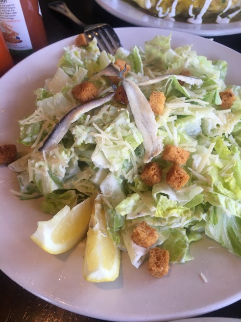 Cesar salad with real… yes real anchovies! Yup my bro shares my love of these tiny salty delicacies! The salad was devine with a tangy dressing that had us both chomping nonstop!