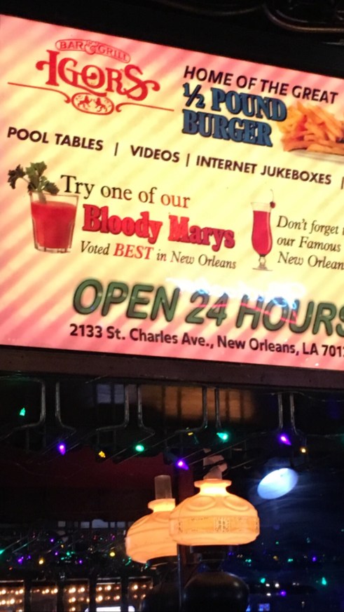 The 20 something drunk gals assured me that “Bailey’s Mom” was a very hip cool woman much like myself. They then bestowed me with some Mardi Gras Beads and told me to get a “Bloody Mary” at Igor’s … since they had the best ones in NOLA!