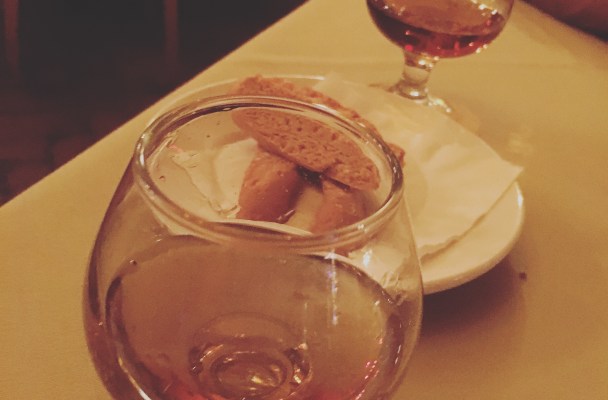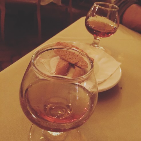 It’s always a sweet surprise when 2 glasses of amaretto liquor and a handful of biscotti magically appear at your dinner table.