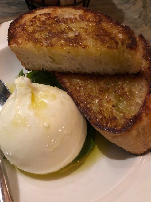 First course: Burrata lots of yum. Crispy olive oil laden bread. Creamy cheese. Heaven!