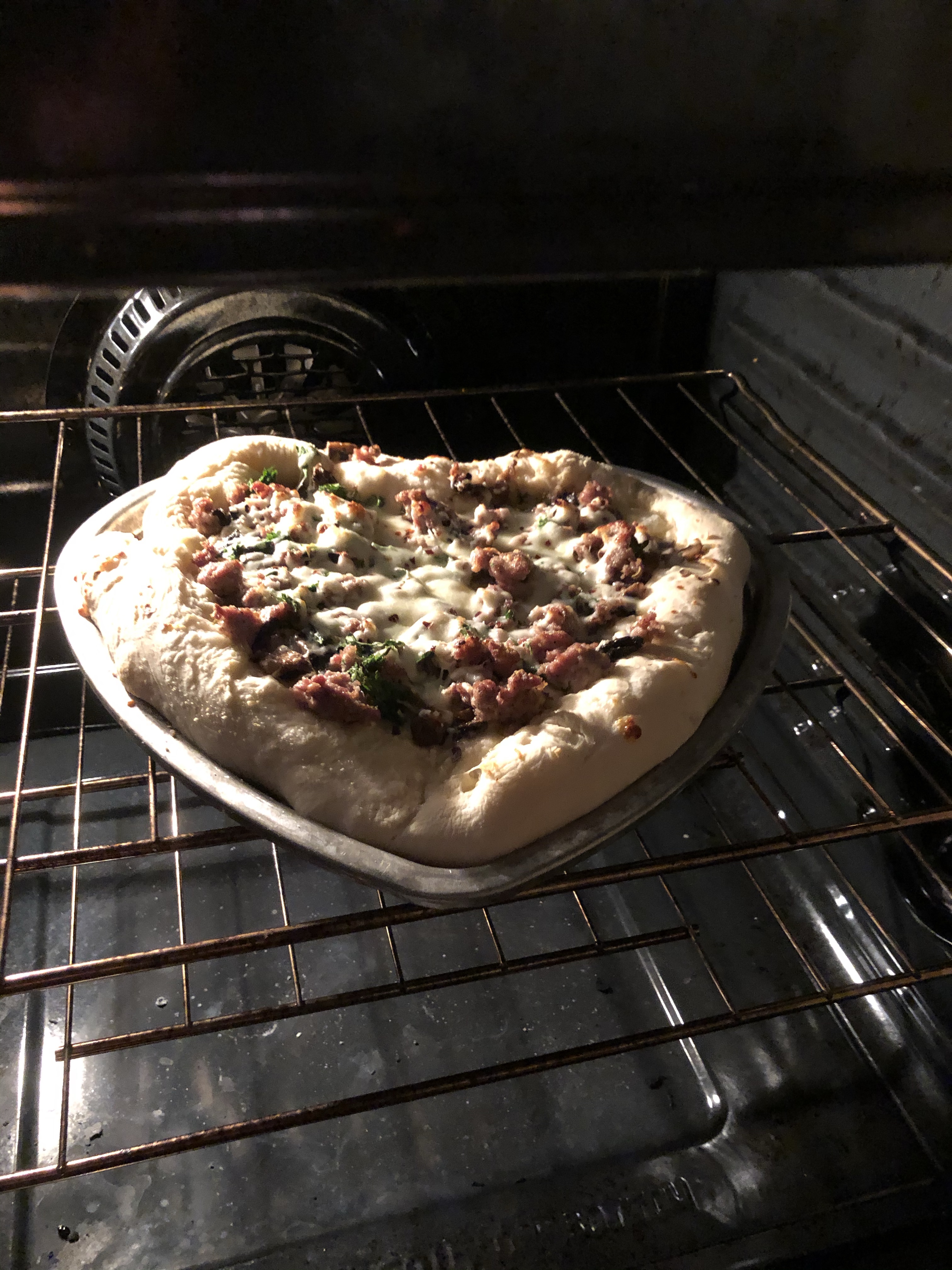 So what’s an Italian girl to do but just make a sausage, mushroom ( sautés w/ butter garlic parsley &marsala) parmigiano and mozzarella cheese. Sprinkle some red pepper flakes… and there you go!