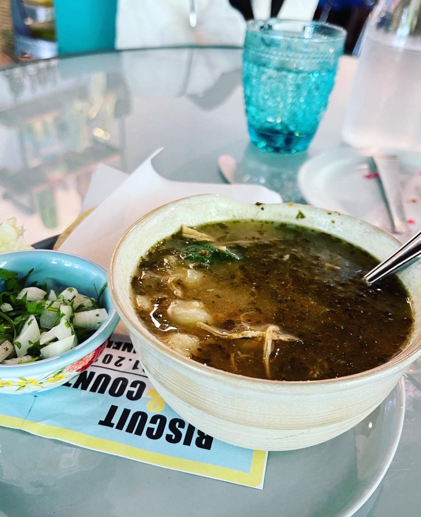 I kept seeing the waitress passing out bowls of posole ( green Chile soup with hominy). I thought to myself, “maybe I should order some just to try it… it looks so good!”