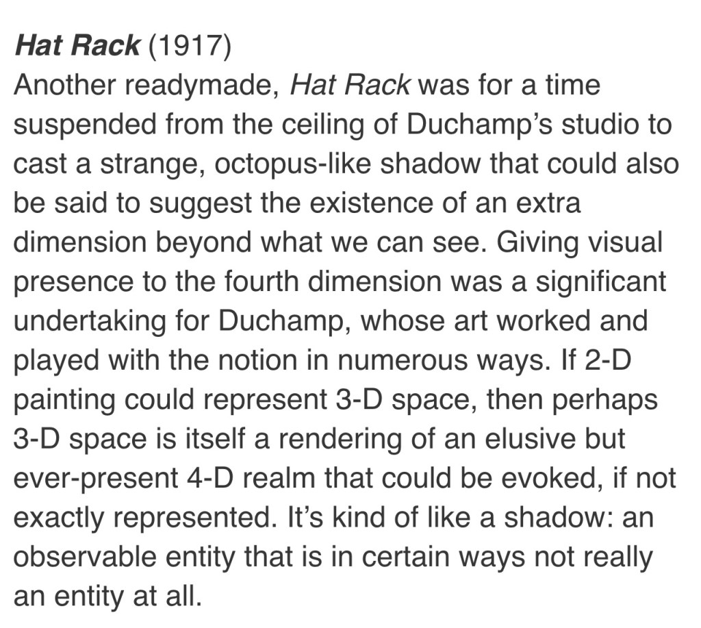 On the right to Duchamp’s hat rack is an octopus like figure I kept seeing on the door of the bathroom at the clinic where I’ve been working covering for a physician client of mine. The shadow much like “The Hat Rack” is indicative of a “4th dimensional realm.” A realm between “time and space.” And I guess you can say “light and shadow,” aka “chiaroscuro.”